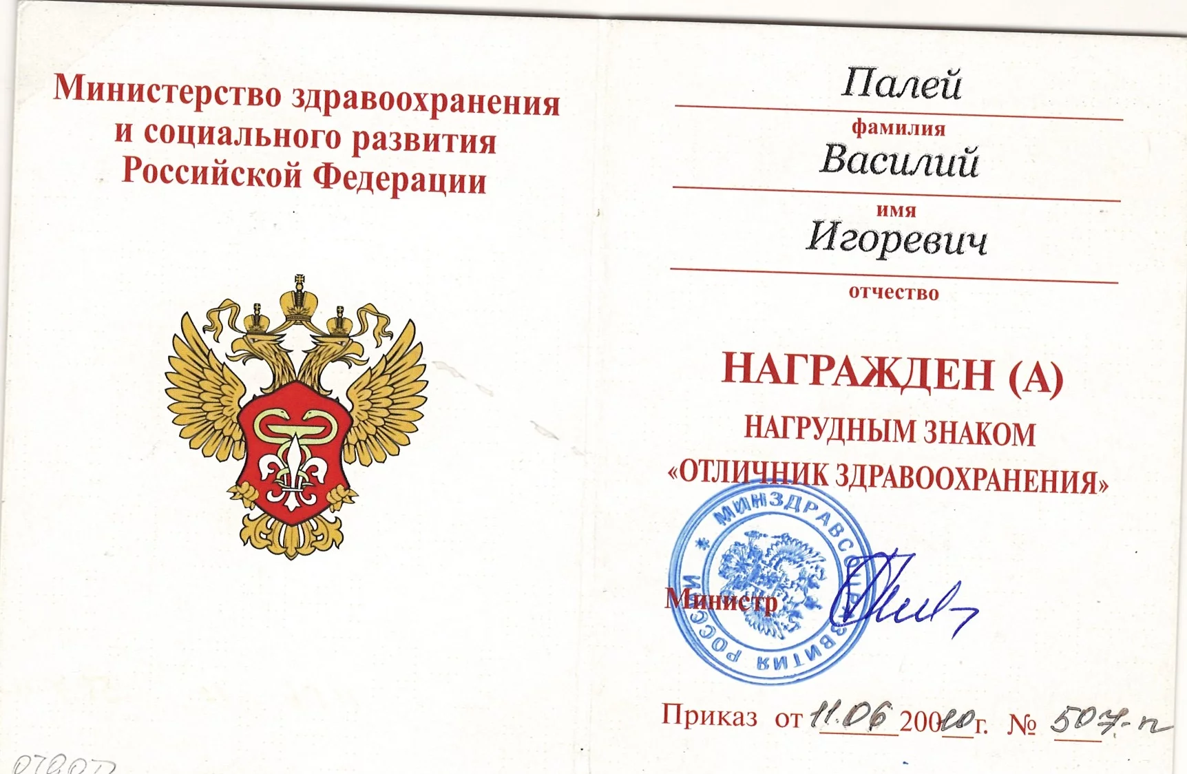 Палей Василий Игоревич. Врач-стоматолог-ортопед высшей категории, имеет многолетнюю практику в стоматологии ортопедической. Награжден нагрудным знаком Министерства здравоохранения и социального развития Российской Федерации «Отличник здравоохранения». Награжден орденом «За заслуги перед стоматологией» II степени Стоматологической ассоциацией России